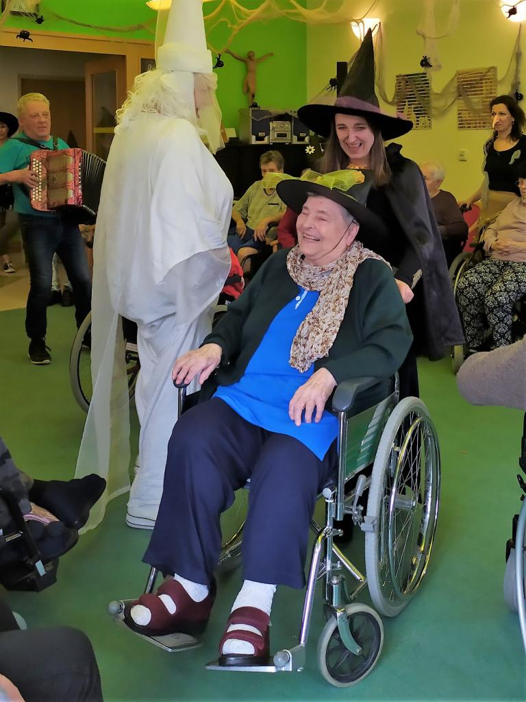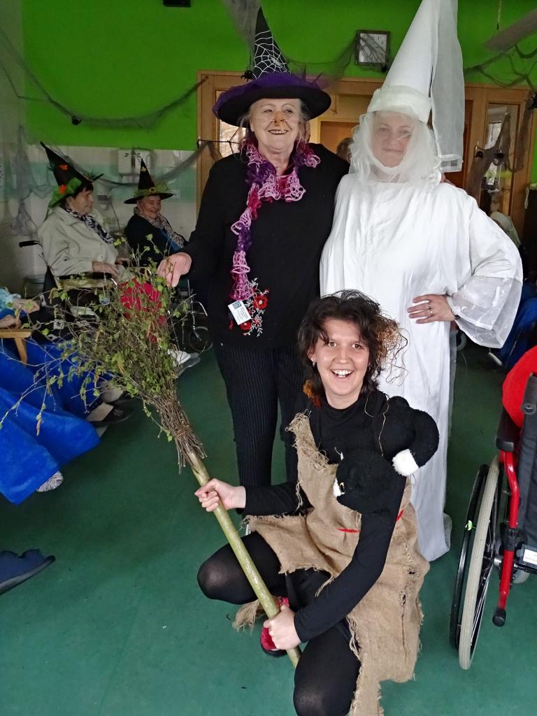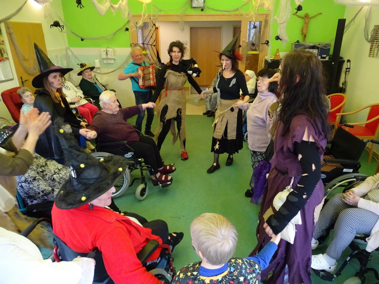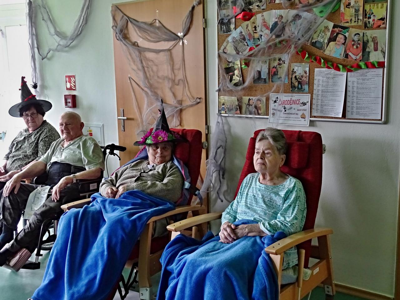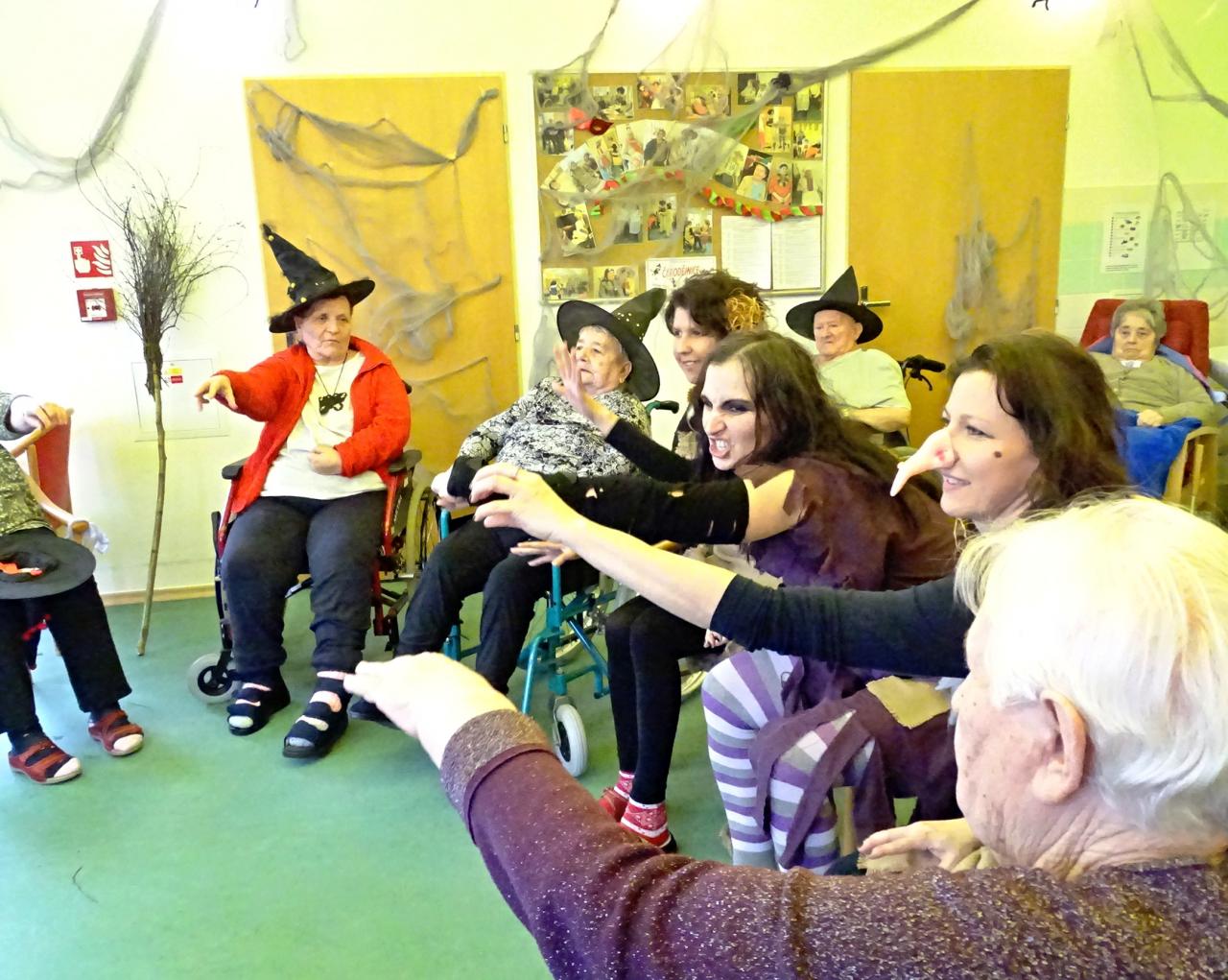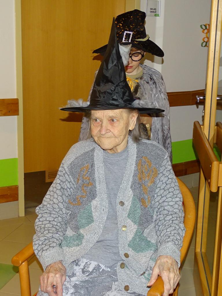 Téměř všechni přítomní měli čarodějnické klobouky, které si k této příležitosti nazdobili. Kdo klobouk neměl, mohl si klobouk vypůjčit - ať už zdobený či ne. K tanci a poslechu nám hrál pan Hofírek na harmoniku a mezitím náš pan údržbář opékal párky, na kterých jsme si společně opravdu pochutnali. Kdo se akce nemohl či nechtěl zúčastnit, dostal opečený párek na pokoj. Na závěr jsme si zatančili "kočičí tanec".