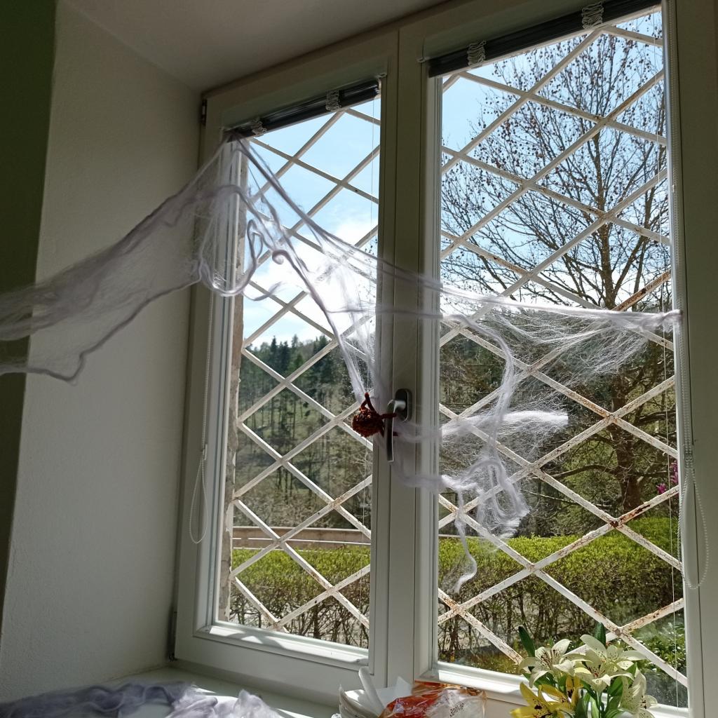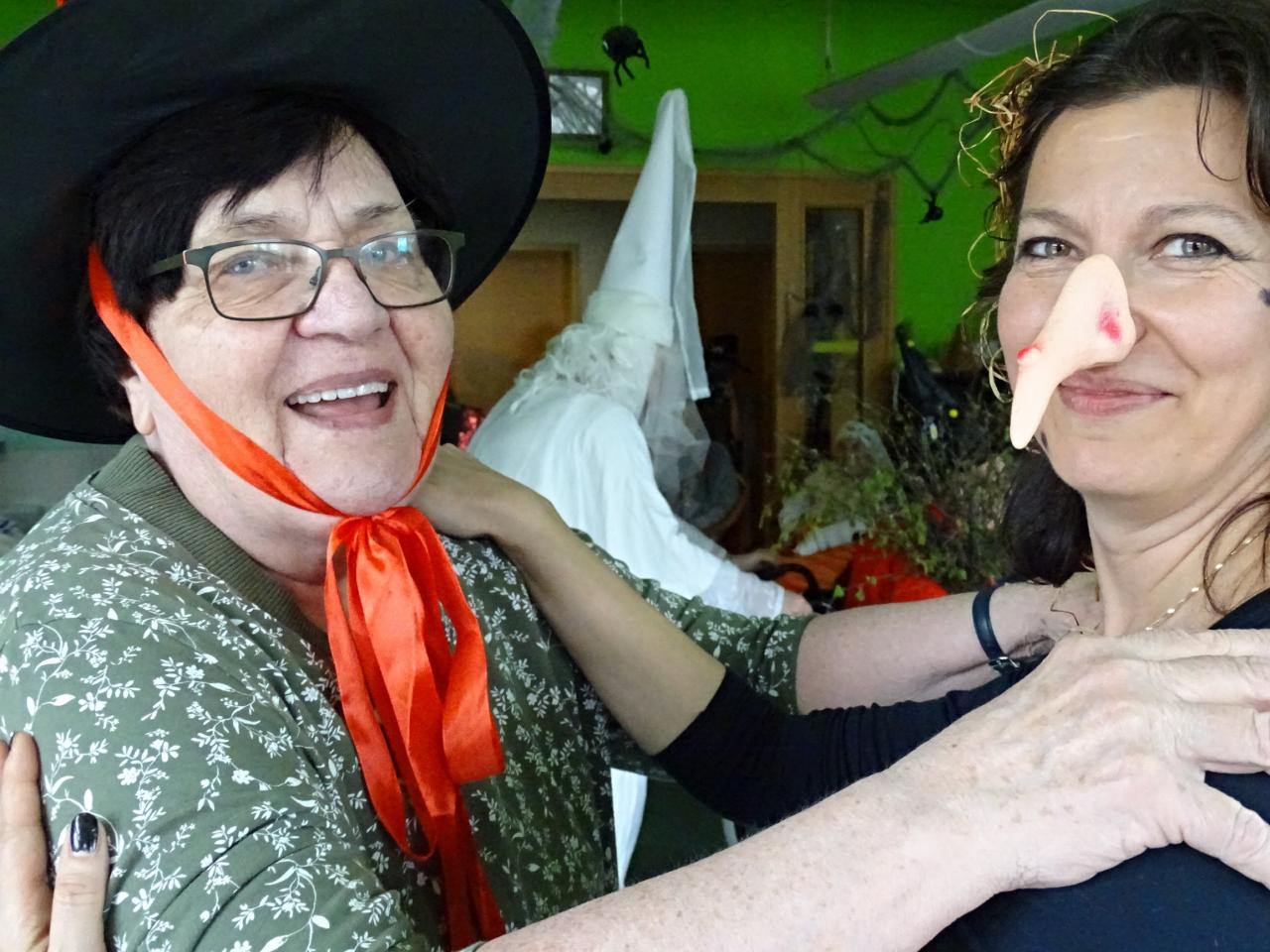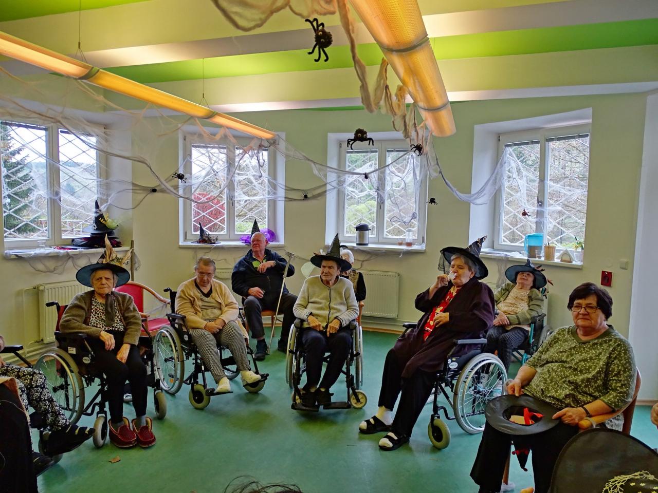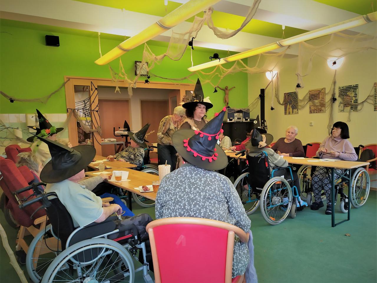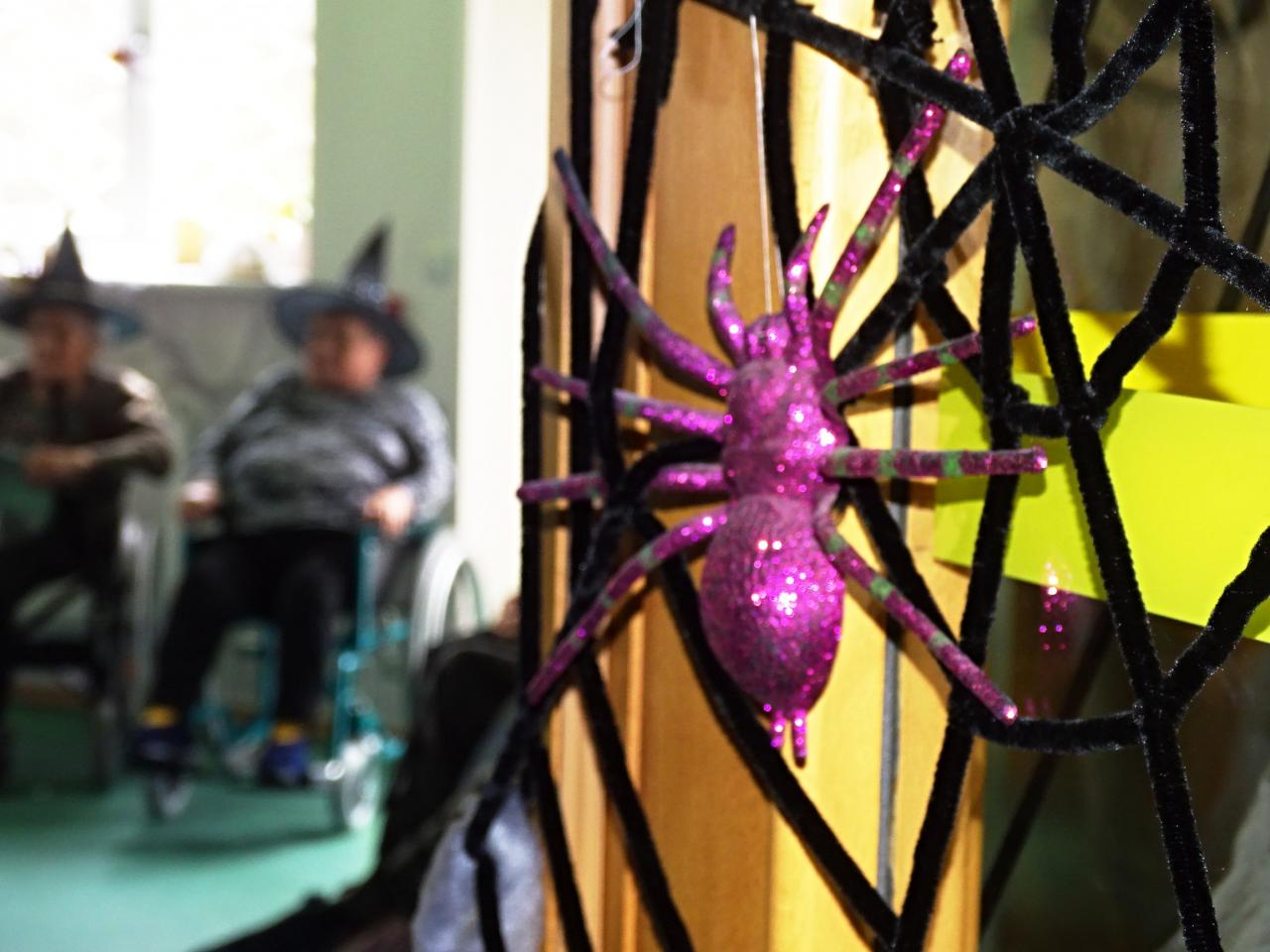 Sešli jsme se v jídelně, která se proměnila v sál plný pavučin a pavouků, které vyrobily klientky spolu s aktivizační pracovnicí.